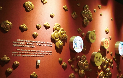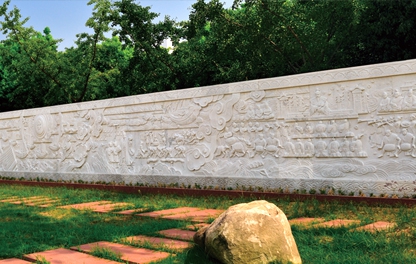 秦始皇統一“六國”后四處尋找長生不老之藥。方士徐福呈報,東海蓬萊、方丈、瀛洲三仙山有仙藥,食后可長生不老。秦始皇大喜。公元前219年和201年,徐福帶領三千童男童女東渡采仙藥。這幅巨型浮雕分為五部分,其間以靈芝祥云相連。